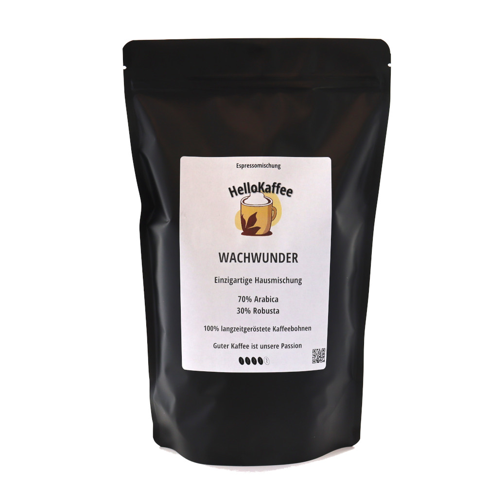 Das HelloKaffee WACHWUNDER ist eine kräftige Mischung aus zwei südamerikanischen Arabica-Bohnen und einer indischen Robusta-Sorte.